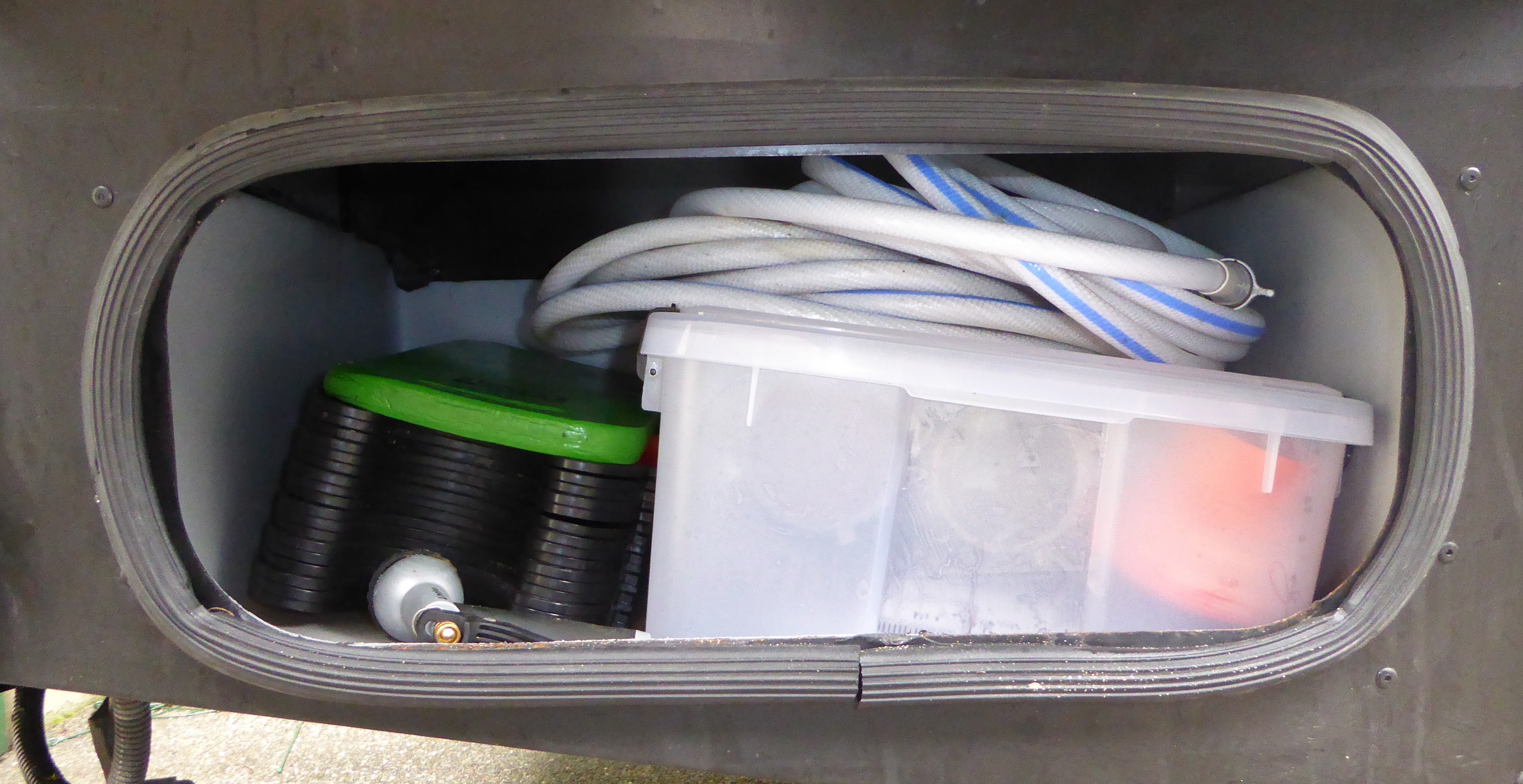 The Navion has an exterior compartment on the rear right side that has a seal and is apparently for wet items. I had stored the sewer hose and connections in here in a treated canvas bag, but the zipper broke and things were just not “tidy” enough.