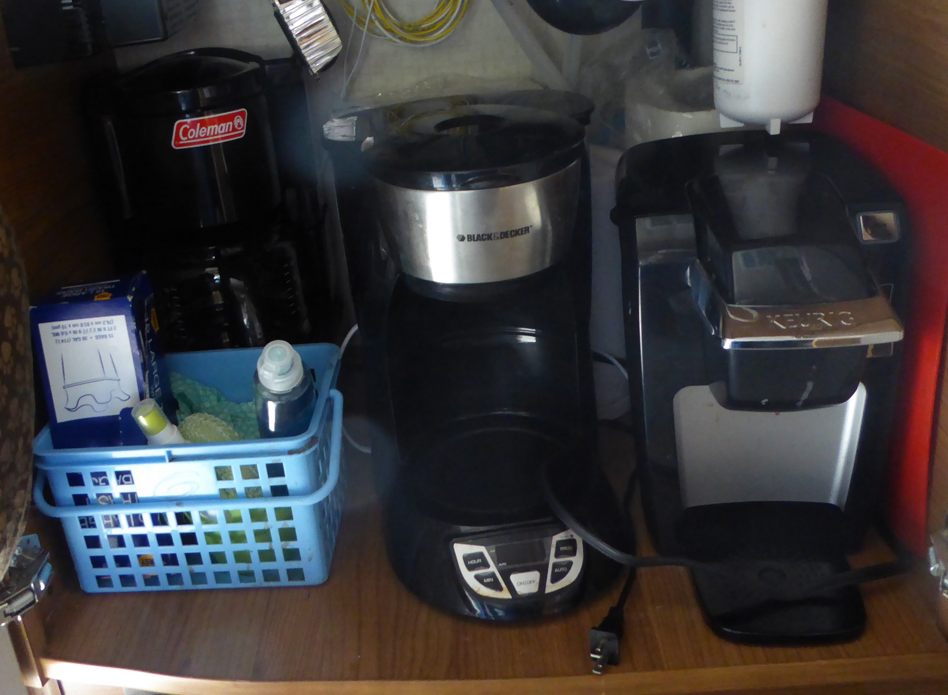 A coffee aficionados, we needed a taller and convenient place for the coffee makers. Under the kitchen sink is ideal for us. The Black & Decker machine is used in the mornings when we leave as we can make a pot of half-caf in the thermal carafe that lasts until lunch. On the left is our drip coffee maker for boondocking (using the stove) and the pod machine is used when we stay more than one night as we have slightly different tastes in the boldness of the roast. Mark us down as addicts.